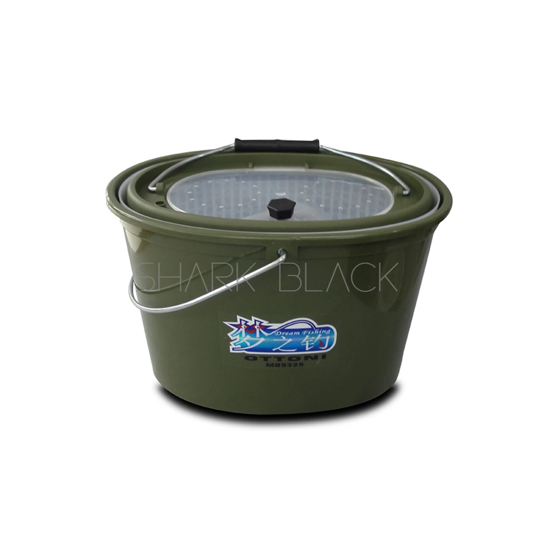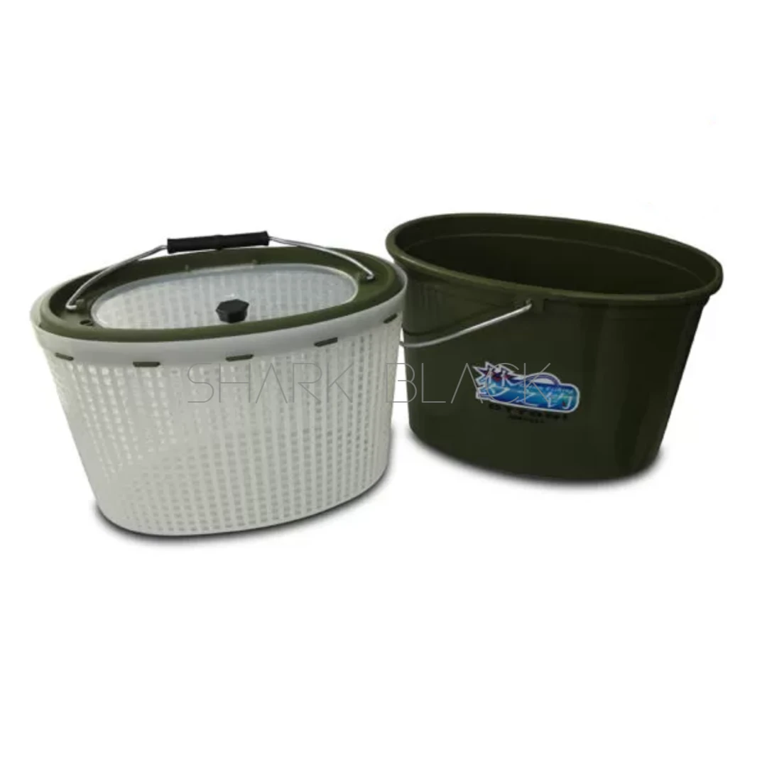 Balde pequeño ovalado con cesta interna extraíble y tapa perforada para mantener el cebo vivo fresco y oxigenado. Diseño compacto y resistente con asa ergonómica.