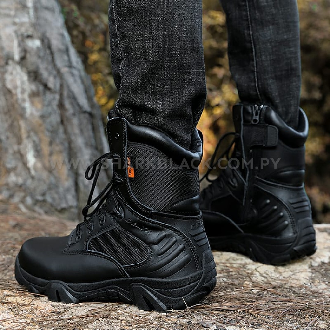 Su suela de goma con diseño antideslizante garantiza agarre firme en todo tipo de terreno, mientras que su estructura de caña alta ofrece excelente soporte al tobillo, ideal para trabajo táctico, seguridad, outdoor o entrenamiento militar.