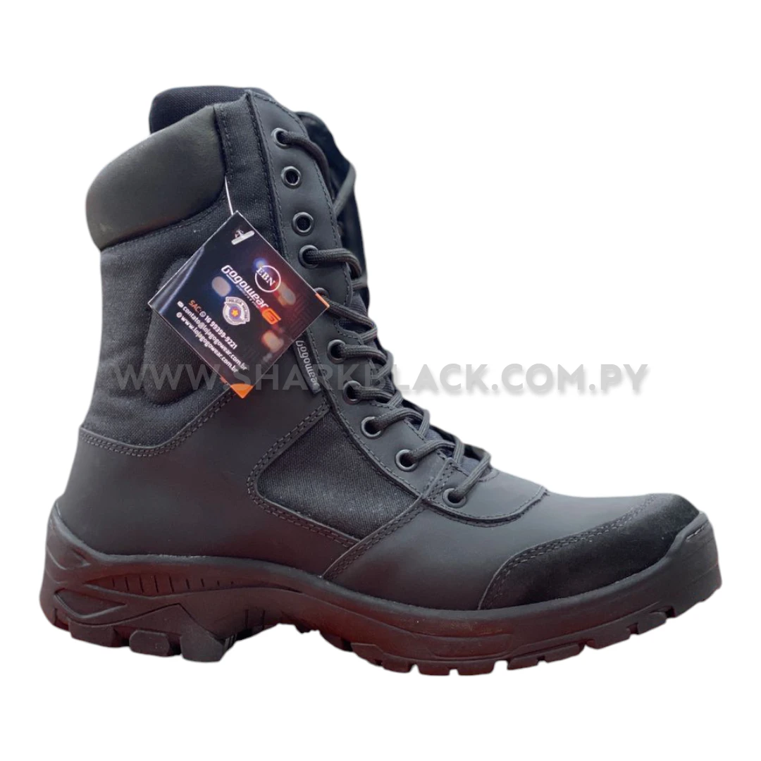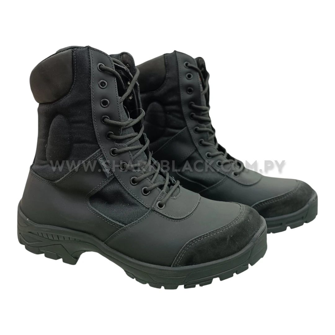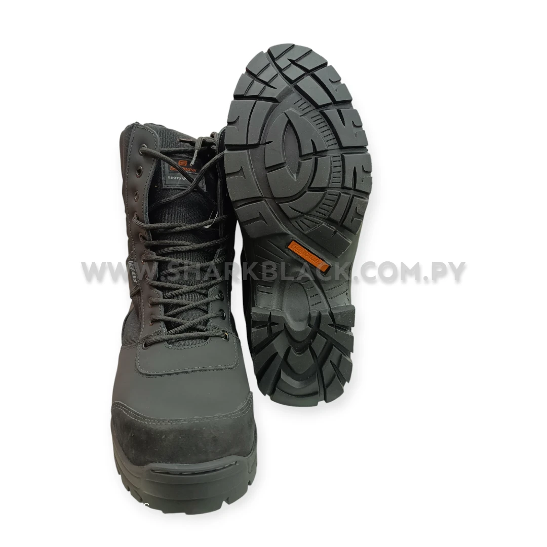 Fabricada con materiales de alto rendimiento, esta bota combina un acabado negro grafito con refuerzos en áreas de impacto, logrando una apariencia táctica moderna y funcional.