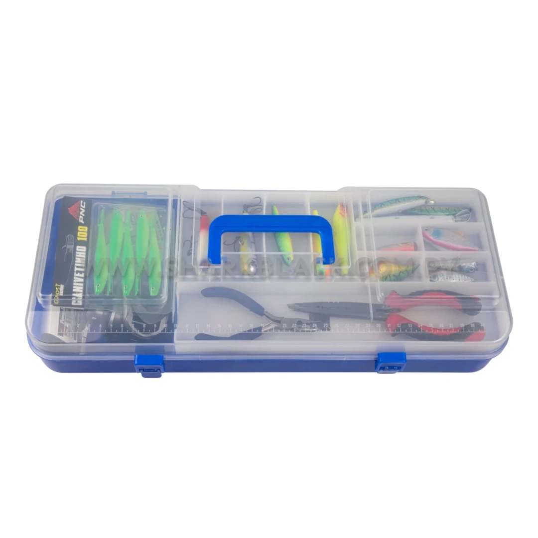 Dispone de una bandeja removible que facilita la organización y permite aprovechar mejor el espacio interno, siendo posible guardar molinetes o carretilhas en el compartimento principal. Además, su alça reforzada brinda un transporte cómodo y seguro.
