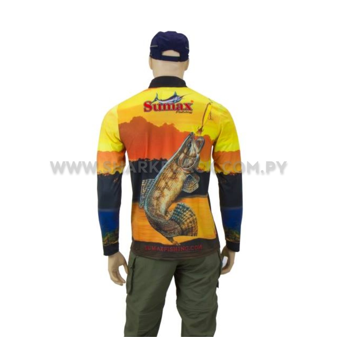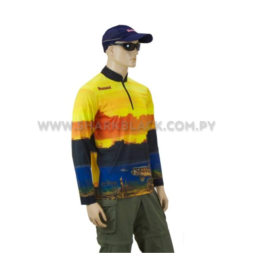 Su diseño de manga larga se distingue por un impactante estampado de atardecer con silueta de pez, que combina tonos cálidos y vibrantes para un look moderno y único. Incluye cuello alto con cremallera corta para mayor confort y practicidad. Disponible en talles desde S hasta XXL, adaptándose a diferentes perfiles de pescadores.