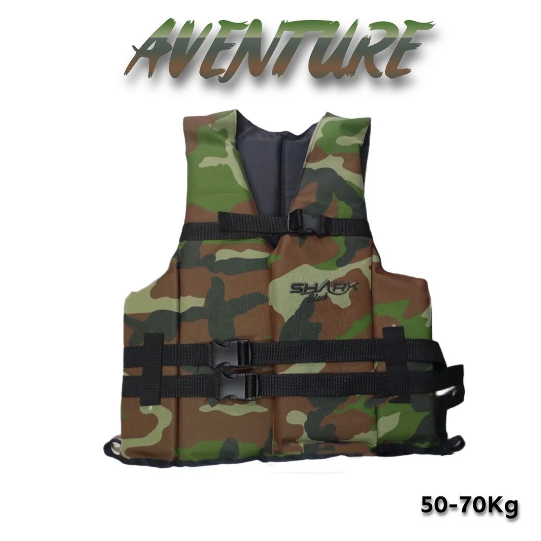 Chaleco salvavidas Shark Black Aventure Camu para 50 a 70 kg, con ajuste seguro y diseño camuflado.