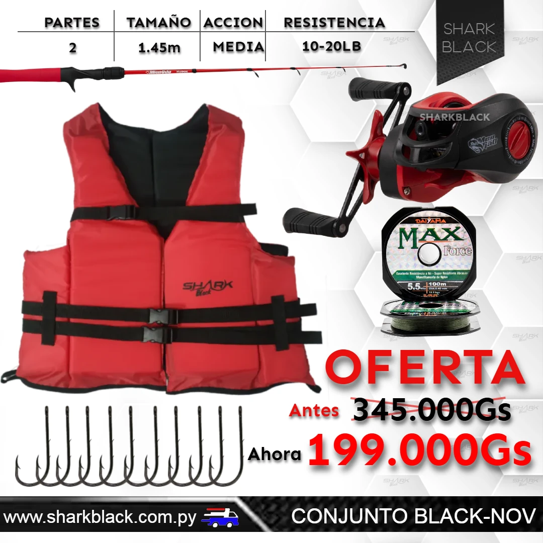 El Conjunto Black-Nov es una opción completa y accesible para quienes buscan iniciarse en la pesca o renovar su equipo con un combo funcional, resistente y de gran rendimiento. Incluye un molinete Shark Black, una vara de fibra sólida, un chaleco salvavidas Shark Black, línea multifilamento Max Force 8X, y un set de anzuelos variados.