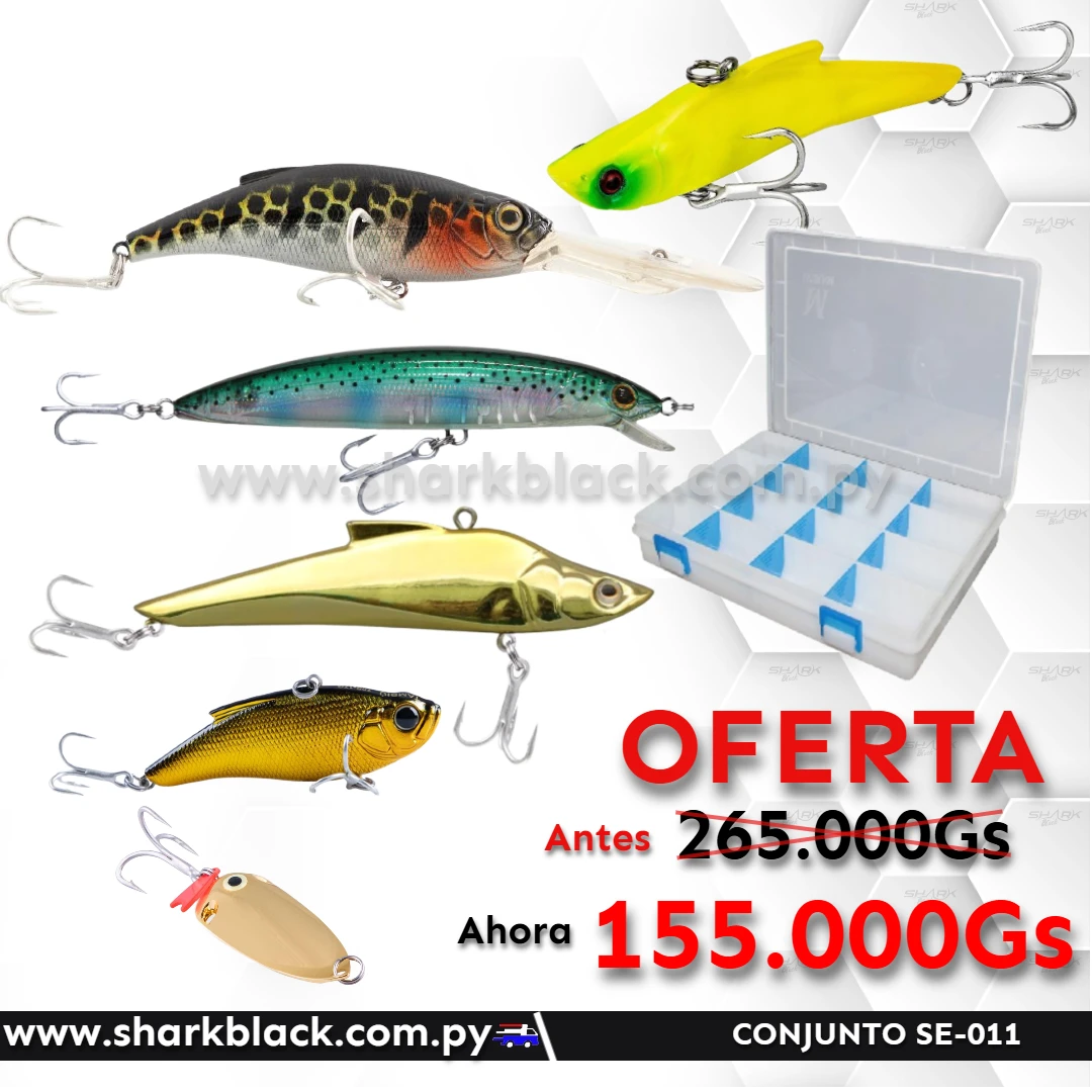 El Conjunto de Señuelos SE-011 es la elección ideal para pescadores que buscan variedad y efectividad en una sola compra. Incluye 6 señuelos de diferentes tamaños, colores y acciones, diseñados para atraer especies en agua dulce y salada. Cada modelo cuenta con triples de acero resistentes y acabados realistas que imitan a la perfección los movimientos de peces presa. El pack incorpora además una caja organizadora plástica con divisiones internas, ideal para mantener todos los señuelos ordenados y listos para la acción.