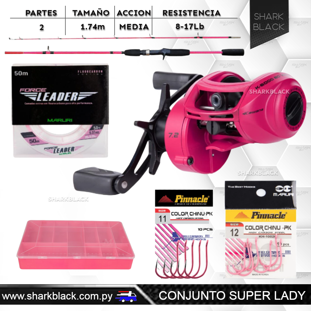 El Conjunto Super Lady ha sido diseñado para quienes buscan un equipo de pesca que combine funcionalidad y un toque de color.
