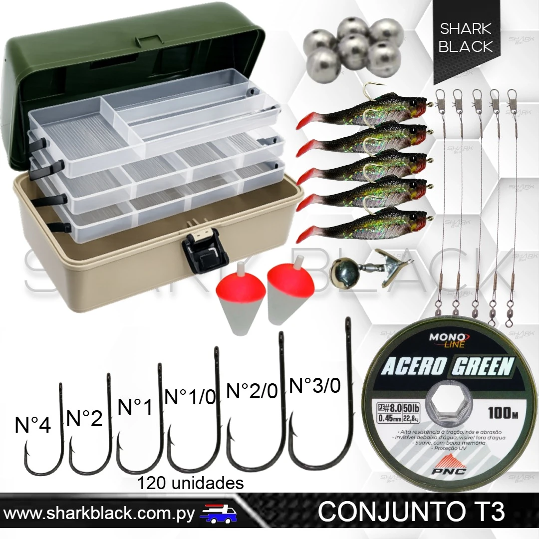 * 120 anzuelos — 20 de cada tamaño: N°4, N°2, N°1, N°1/0, N°2/0 y N°3/0