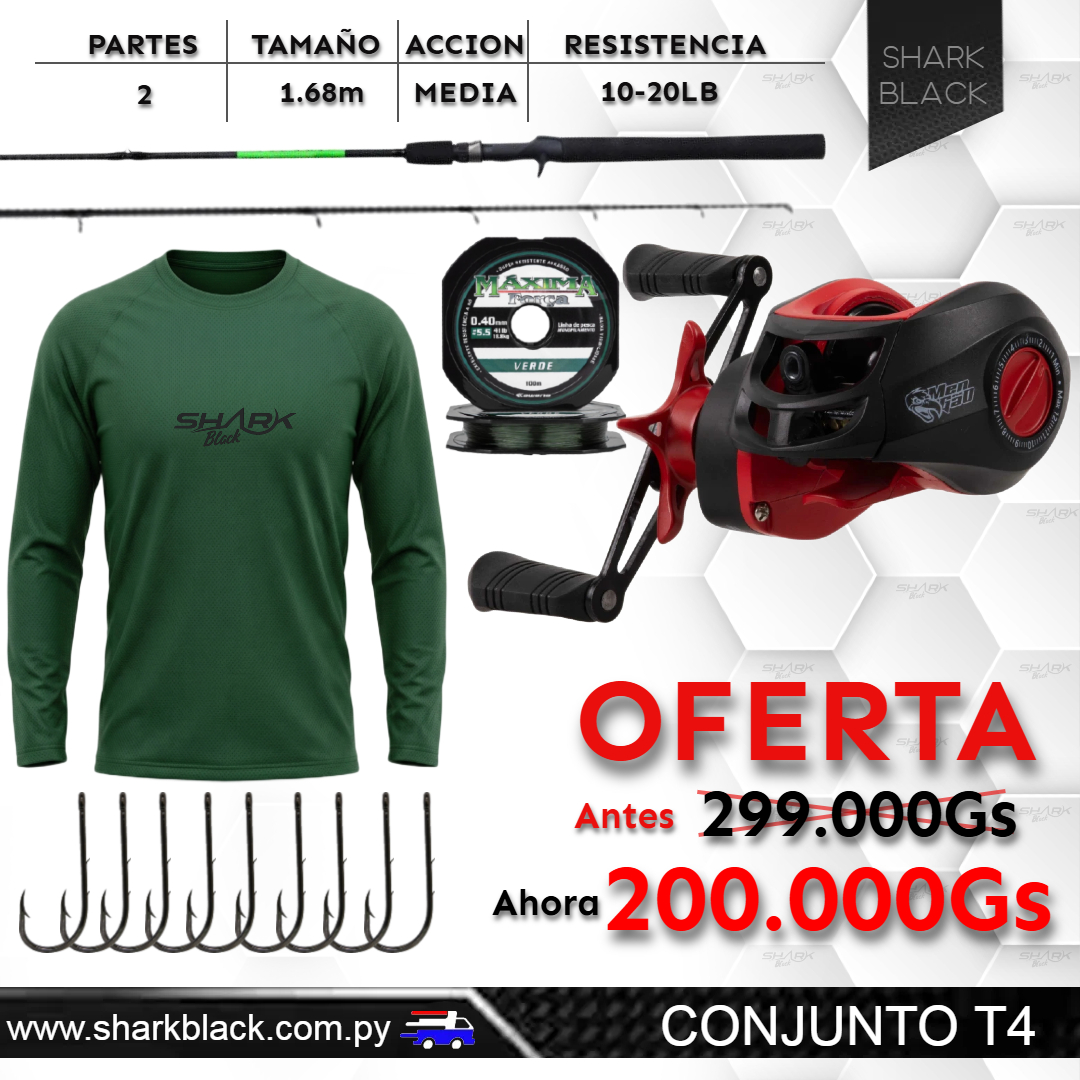 ¿Buscás un combo de pesca casting completo, balanceado y a precio promocional? El Conjunto T4 de Shark Black te da todo lo que necesitás para salir a pescar hoy mismo: vara profesional, reel de perfil bajo, línea de calidad, anzuelos y hasta una remera técnica de regalo.