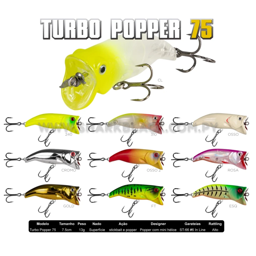 Fabricado con materiales resistentes y equipado con anzuelos triples de alta calidad, el Turbo Popper 75 ofrece durabilidad, clavadas seguras y excelente rendimiento tanto en pesca deportiva como recreativa.