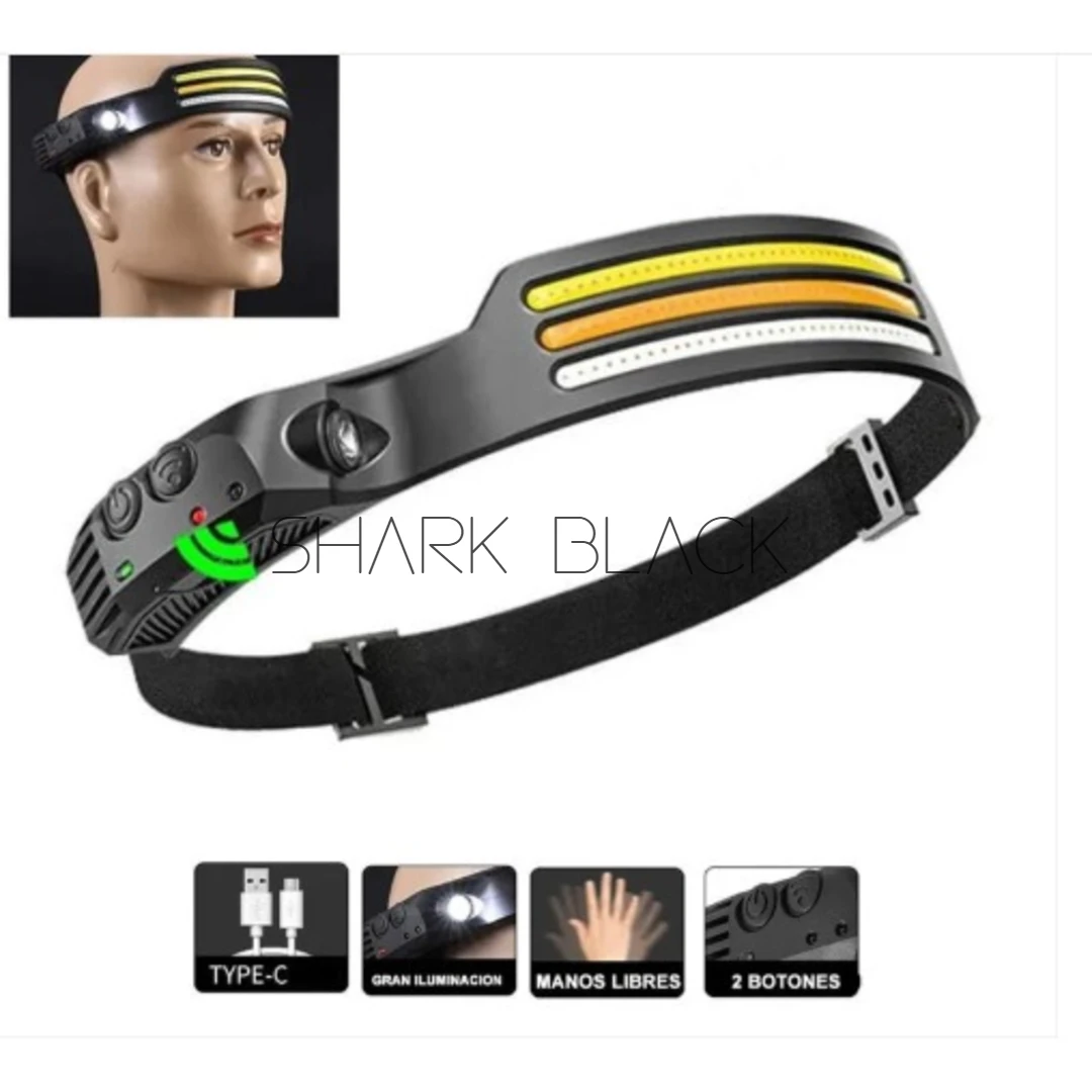 Linterna frontal LED recargable de 3 líneas con carga USB Type-C, banda ajustable y modos de iluminación.