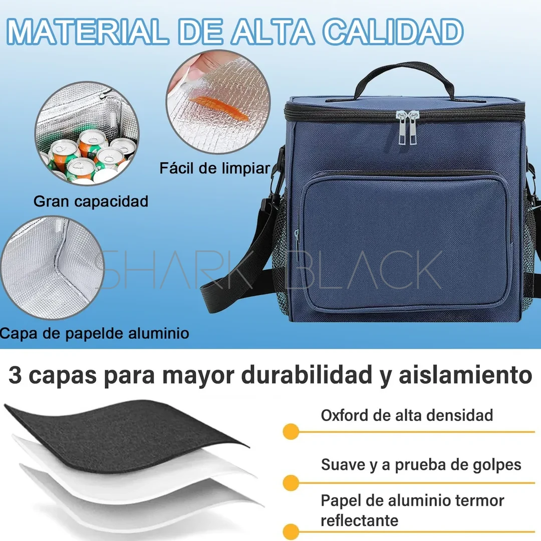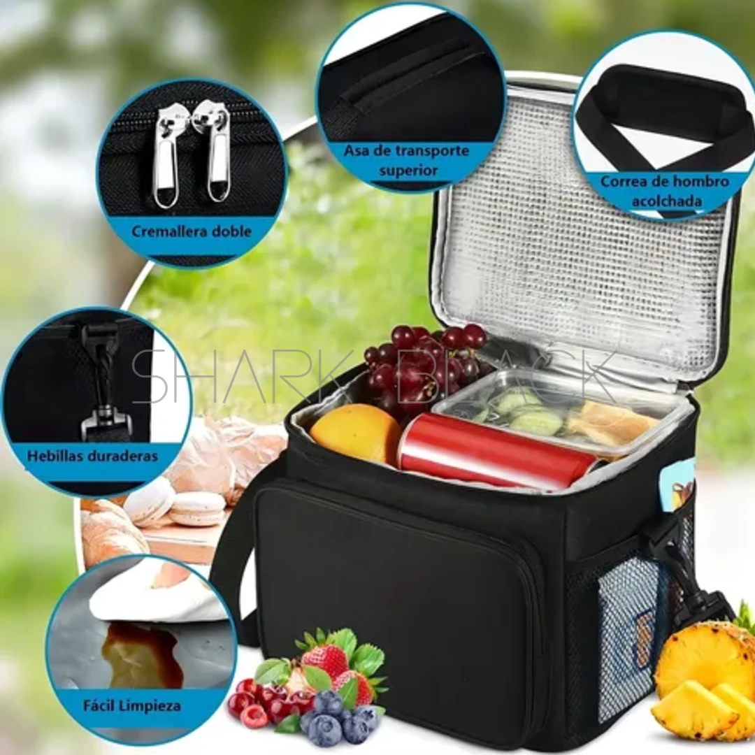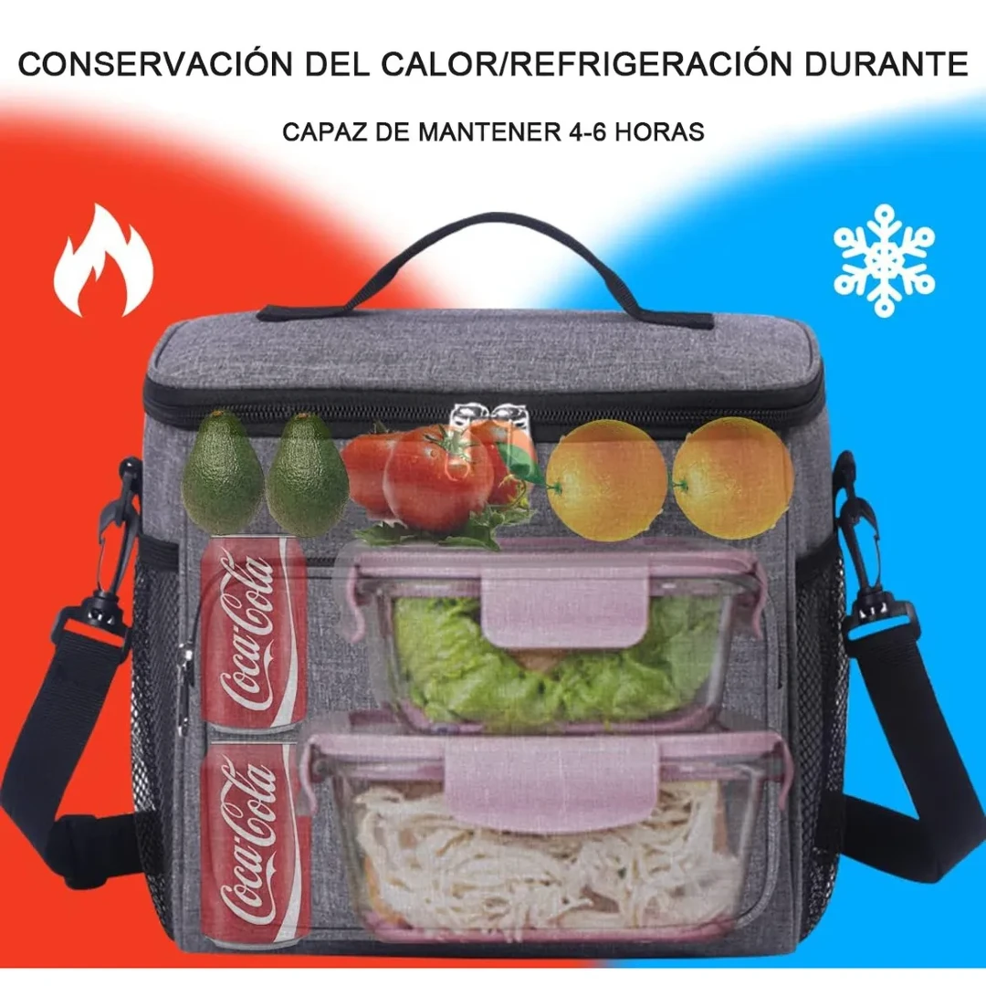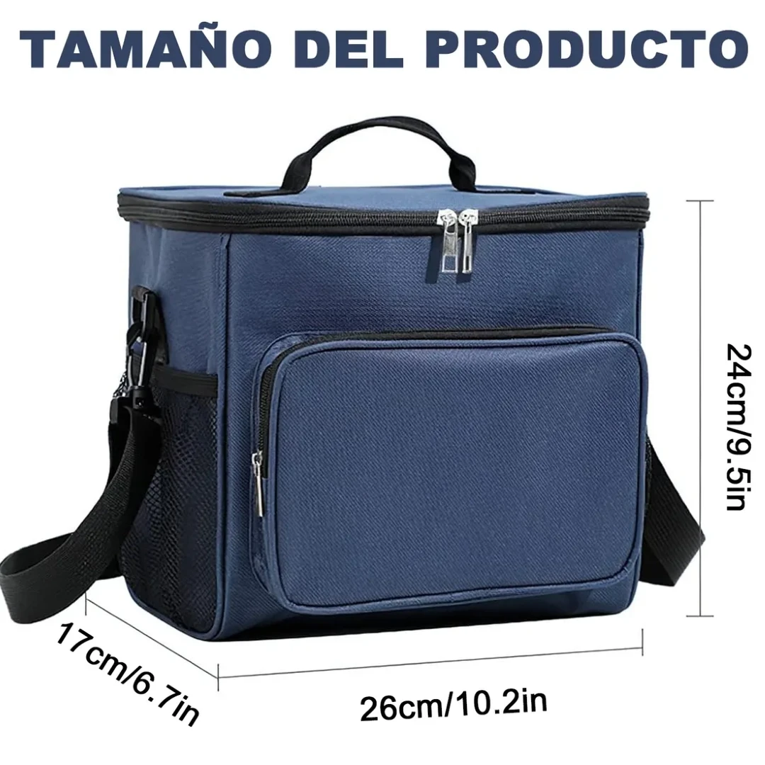 Lonchera térmica multiuso con interior aislante, correa ajustable y bolsillo frontal. Perfecta para mantener tus comidas frescas o calientes todo el día.