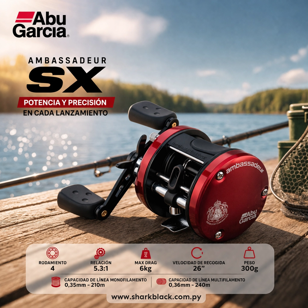 El Abu Garcia Ambassadeur SX 5600 derecho es un reel clásico, resistente y confiable. Con 4 rodamientos, drag de 6 kg, excelente capacidad de línea y construcción robusta, es ideal para pesca exigente en agua dulce y salada