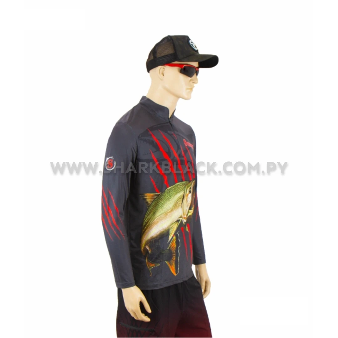 Destaca por su impresión de dorado a todo color sobre fondo oscuro, acompañada de detalles rojos en forma de garras que le dan un aspecto moderno y agresivo. El cuello alto con cremallera corta permite regular la ventilación según necesidad. Disponible en talles desde S hasta 4XL, se adapta a todo tipo de pescadores y entusiastas del outdoor.