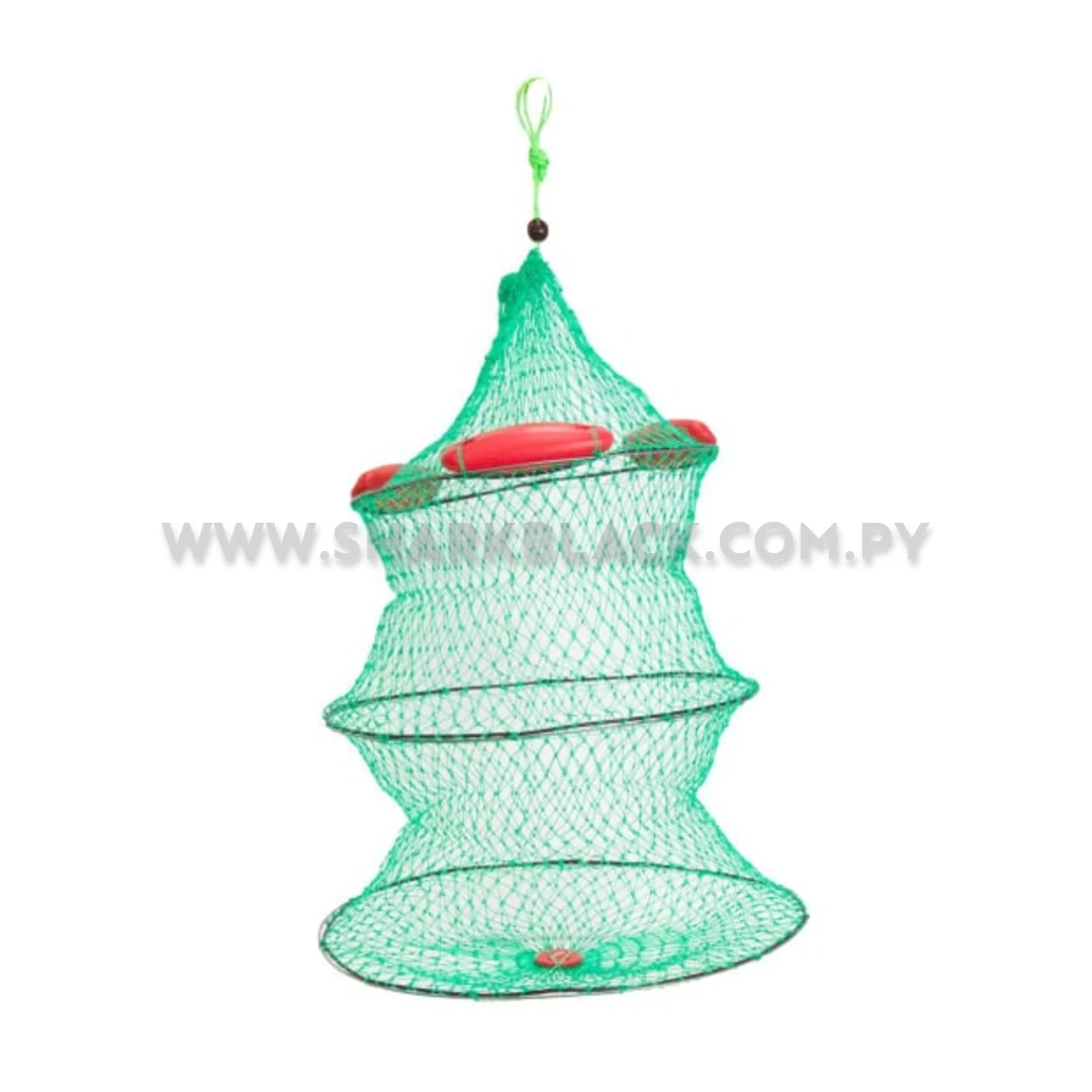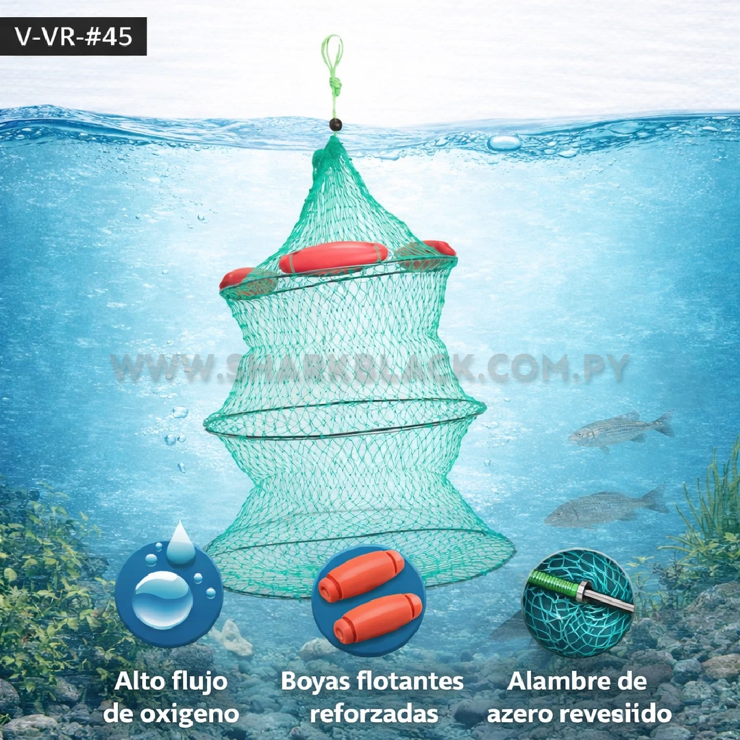 Cuenta con boyas flotantes que mantienen la estructura abierta y estable, además de un sistema de cierre seguro que evita escapes. Su diseño liviano y práctico facilita el transporte y el uso tanto desde la costa como desde embarcaciones, siendo ideal para pesca deportiva y recreativa.