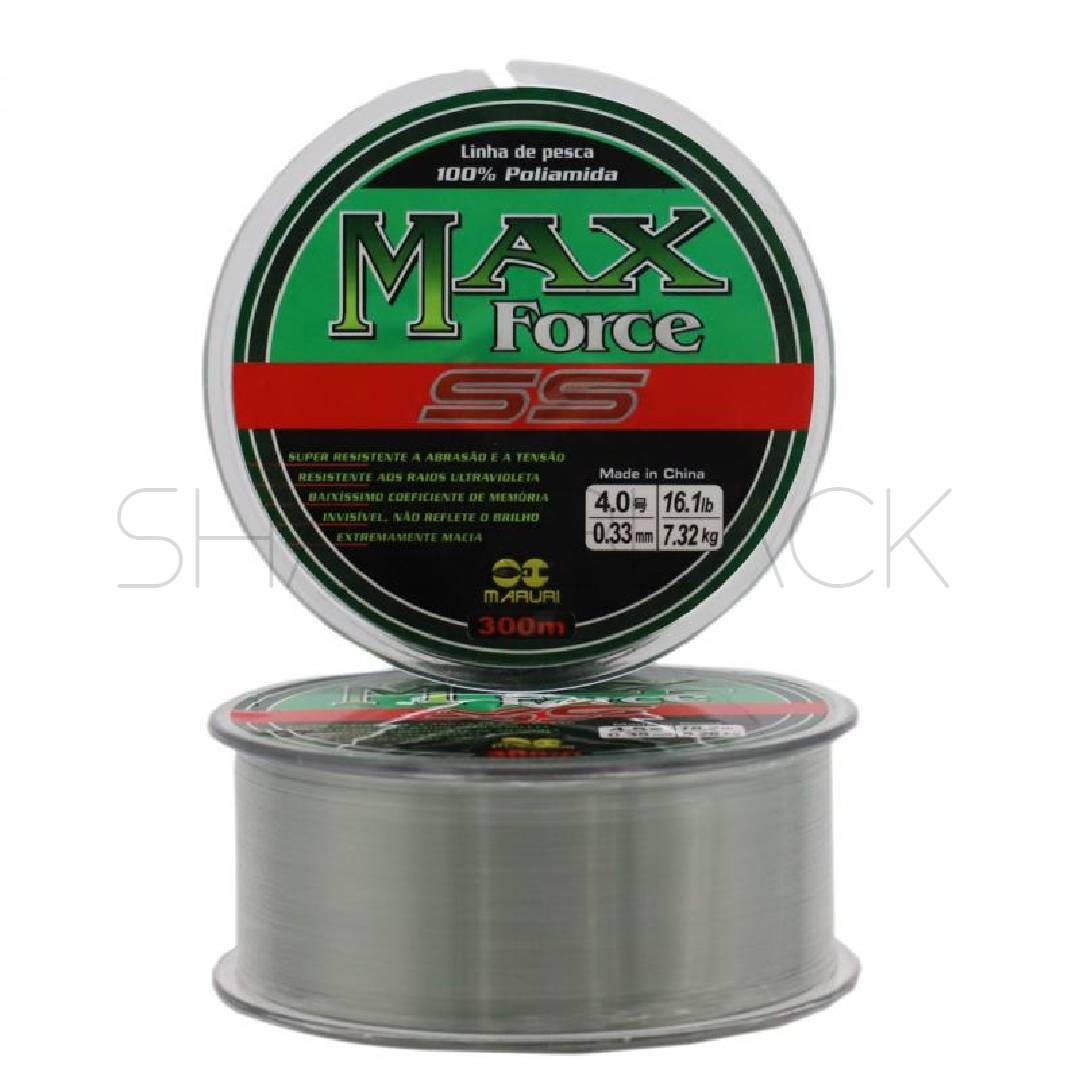 SS MAXFORCE 150 y 300m es de la familia de nylon más vendida en el mercado brasileño, este SS en particular tiene una calidad más, es extremadamente suave, el único que se le compara en esta calidad es el PLATINIUM. Es muy resistente a la abrasión, su color gris cristal lo hace invisible al sumergirlo. se enrolla en el carrete de manera estándar para que el hilo en la parte inferior del carrete no se deforme, excepto para 0,70, 0,80 y 0,90.